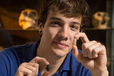 Imagine walking through a field and finding prehistoric projectile points (or arrowheads), fish hooks, a knife, animal remains, a scraper and pottery shards. That is what Wright State student Tyler Heneghan found through his school field work at the Fort Ancient Earthworks, along with learning experimental archaeology through his internship at the Dayton Society of Natural History and his time at Sun Watch Indian Village.