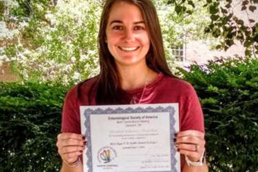 Environmental Sciences Ph.D. program student, Libby Roberson was awarded Third Place for outstanding presentation of entomological research in the Ph.D. student competition at the North Central Branch of the Entomological Society of America meeting in Cleveland. Her talk in the Systematic, Evolution, and Biodiversity section was entitled "Burning bush (Euonymous alatus) and deer alter spider assemblages". Libby is advised by program director, Don Cipollini, Ph.D. Congratulations to Libby!