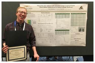 Trevor Schumacher was recently honored with an Outstanding Poster award for his presentation at the National Meeting of the American Chemical Society, which was held in San Diego, CA during the week of March 15th. The award was bestowed by the Polymer Division of the American Chemical Society and was presented by president of the division, Dr. Karl Haider, at an awards ceremony on Wednesday, March 17th. He received a framed certificate as well as a cash prize. Trevor is a Master of Science student in the Department of Chemistry and a member of Professor Eric Fossum’s research group. The