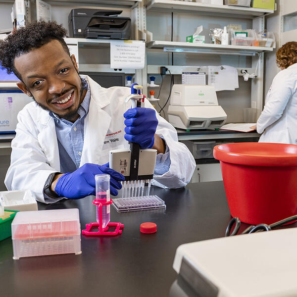 Aston Waite III, a Louis Stokes Alliance for Minority Participation scholar, conducts research in a lab in the Department of Neuroscience, Cell Biology and Physiology.