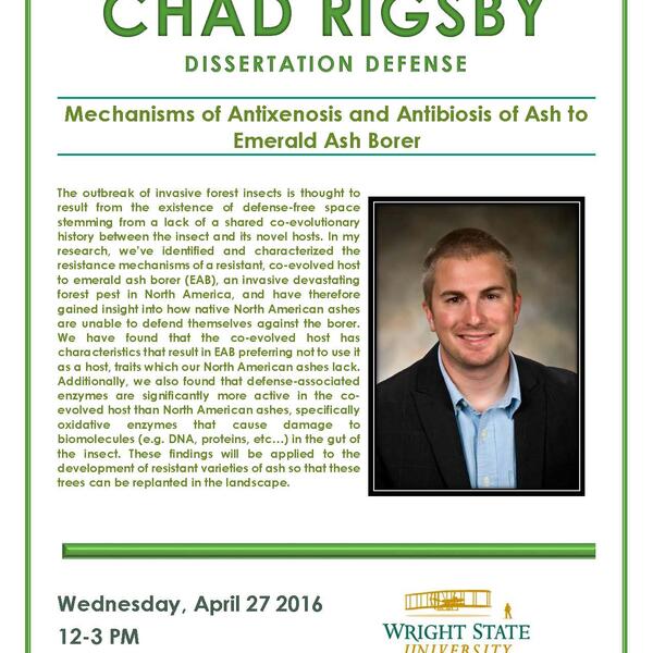 Chad Rigsby, who is advised by Prof. Don Cipollini, will defend his dissertation entitled "Mechanisms of Antixenosis and Antibiosis of Ash to Emerald Ash Borer" on Wednesday, April 27, 2016 in 120 White Hall starting at 12:00 PM. Good luck to Chad on his defense!
