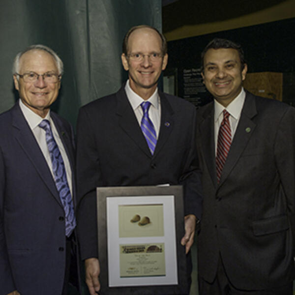 The mayor of La Mancha, Spain, presented the city's Hijo Predilecto de la Ciudad award to Julian Gomez-Cambronero, Ph.D., professor of biochemistry & molecular biology.