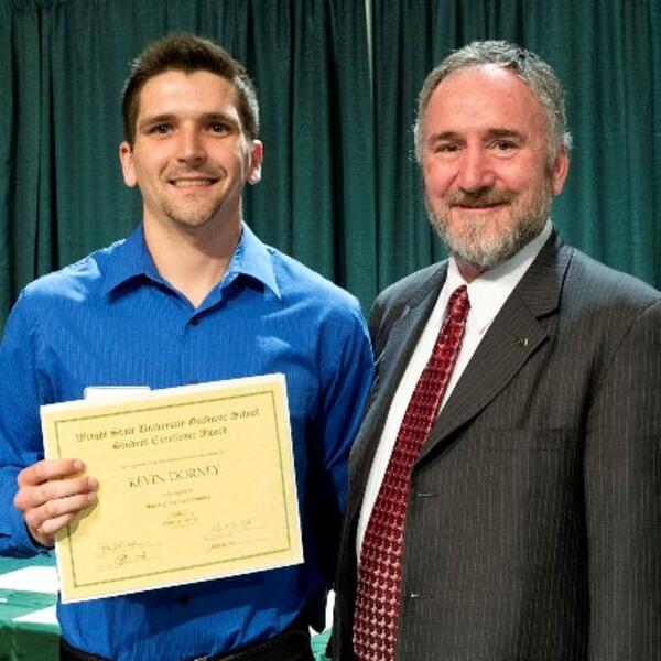 Kevin Dorney received the Graduate Excellence Award from Dr.Robert E. W. Fyffe, Vice-President of Research and Graduate Studies, on April 16, 2014 in recognition of his achievements in the Chemistry Department's Master's Program.