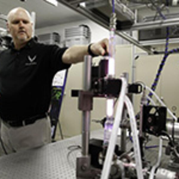 Dr. Steven Adams, a physicist with the Air Force Research Laboratory, works in a new laser spectroscopy lab at the Advanced Power and Thermal Reseach Lab at Wright-Patterson Air Force Base.